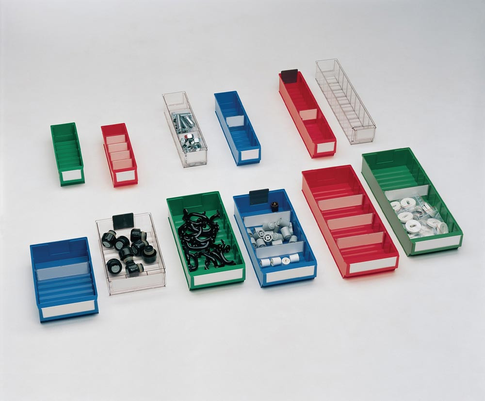 aus hochwertigem Polypropylen · rot · weitgehend beständig gegen die meisten Säuren und Öle · temperaturbeständig von -20 °C bis +80 °C · gewellter Innenboden für die leichte Entnahme von Kleinteilen · robuste Griffmulde mit großer Fläche für Beschriftungsetiketten (s. Zubehör) · variabel einsetzbar durch umsteckbare Trennwände (s. Zubehör) · die optionale Auszugssperre verhindert das Herausrutschen der Box aus dem Regal