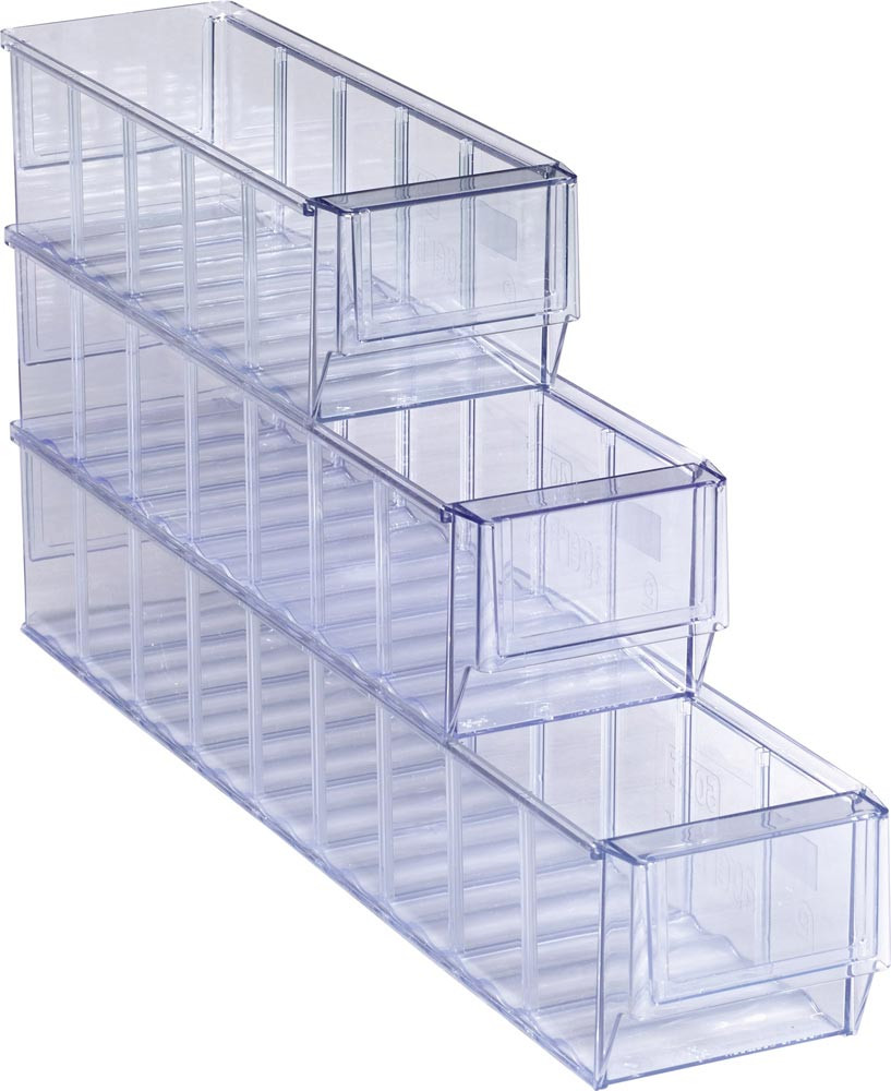 aus SAN · transparent · weitgehend beständig gegen die meisten Säuren und Öle · temperaturbeständig von -20 °C bis +80 °C · gewellter Innenboden für die leichte Entnahme von Kleinteilen · robuste Griffmulde mit großer Fläche für Beschriftungsetiketten (s. Zubehör) · variabel einsetzbar durch umsteckbare Trennwände (s. Zubehör) · die optionale Auszugssperre verhindert das Herausrutschen der Box aus dem Regal