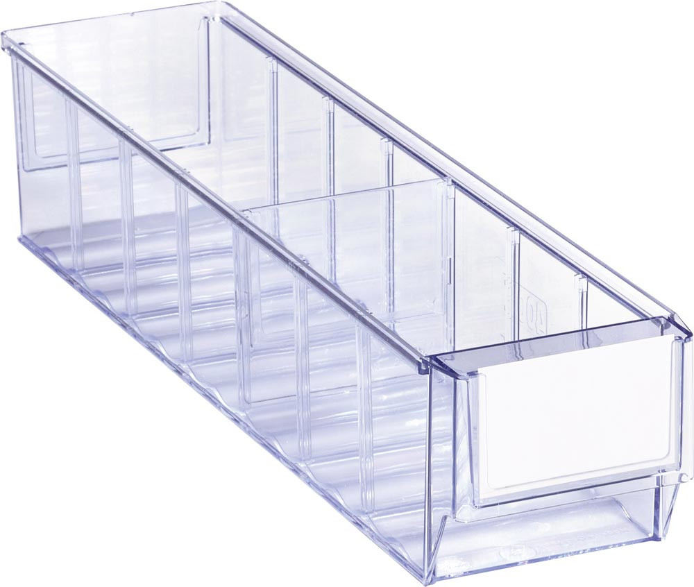 aus SAN · transparent · weitgehend beständig gegen die meisten Säuren und Öle · temperaturbeständig von -20 °C bis +80 °C · gewellter Innenboden für die leichte Entnahme von Kleinteilen · robuste Griffmulde mit großer Fläche für Beschriftungsetiketten (s. Zubehör) · variabel einsetzbar durch umsteckbare Trennwände (s. Zubehör) · die optionale Auszugssperre verhindert das Herausrutschen der Box aus dem Regal