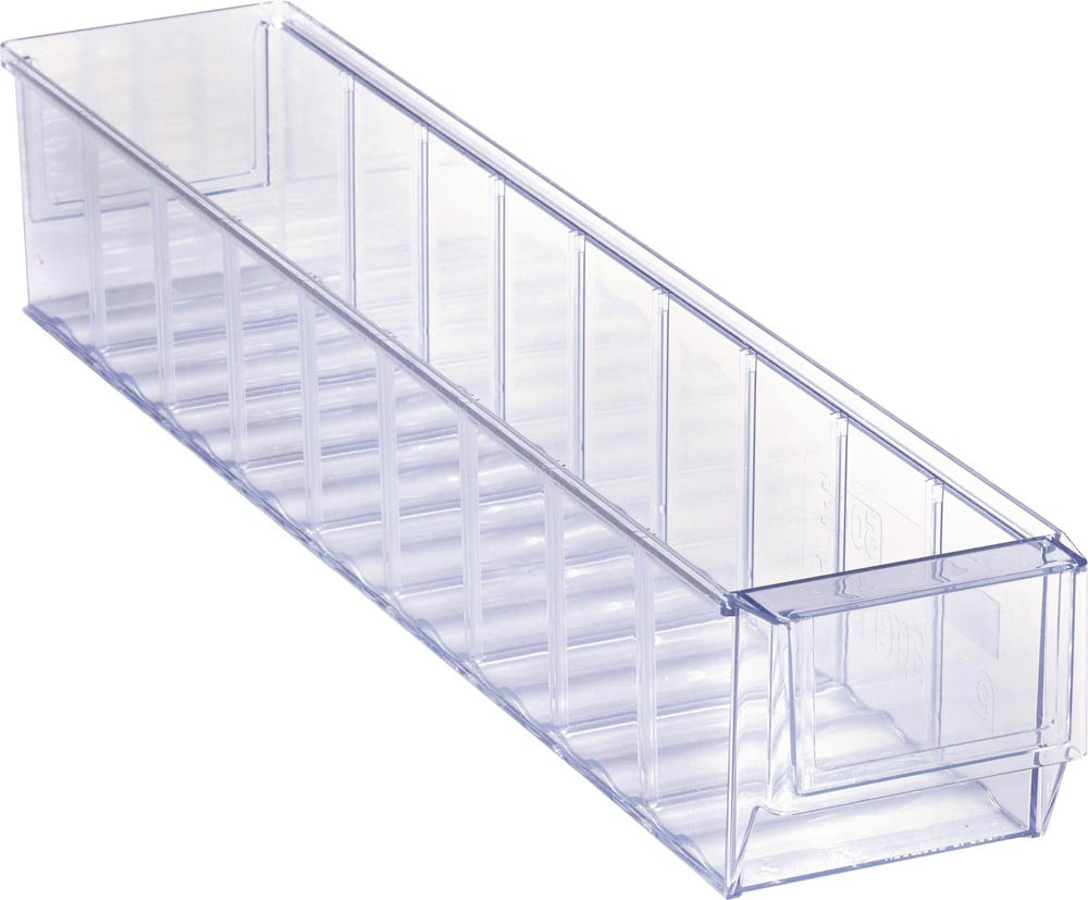 aus SAN · transparent · weitgehend beständig gegen die meisten Säuren und Öle · temperaturbeständig von -20 °C bis +80 °C · gewellter Innenboden für die leichte Entnahme von Kleinteilen · robuste Griffmulde mit großer Fläche für Beschriftungsetiketten (s. Zubehör) · variabel einsetzbar durch umsteckbare Trennwände (s. Zubehör) · die optionale Auszugssperre verhindert das Herausrutschen der Box aus dem Regal