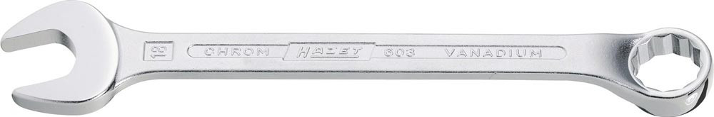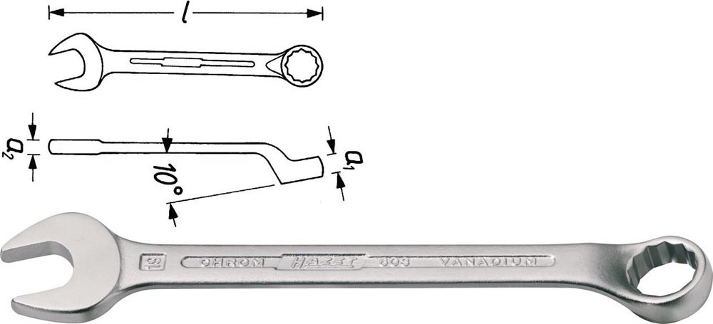 CV-Stahl · verchromt · mit gleichen Schlüsselweiten · Ringseite 10° gekröpft, Maulstellung 15° · Schlüsselweite 5,5 bis 9 mm Ringseite mit Sechskant, ab Schlüsselweite 10 mm Ringseite mit Doppelsechskant