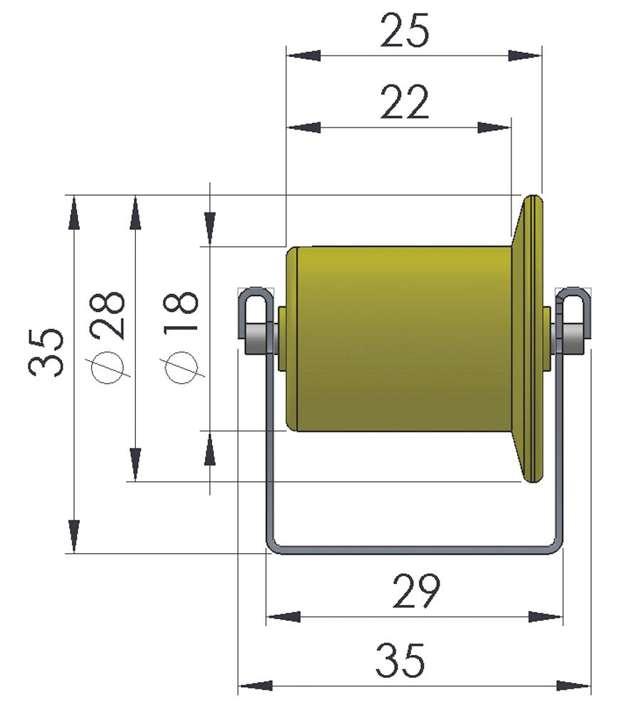 Röllchen-U-Leisten, Profil 26x29x26 mm, verzinkt, Kunststoffrolle mit Spurkranz, Durchm. 18/28 mm, Traglast 6 kg/Rolle, Achsabstand 66 mm