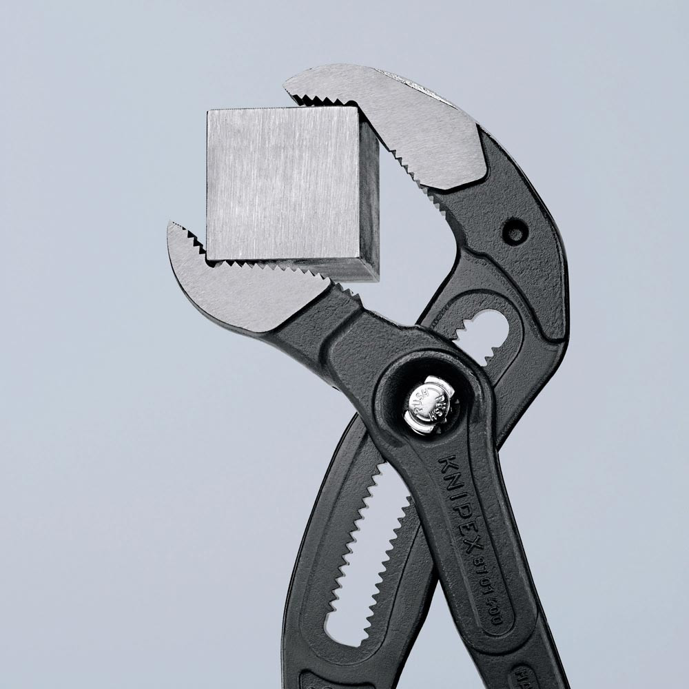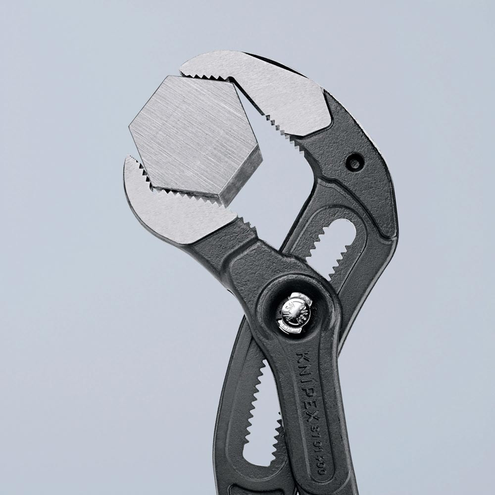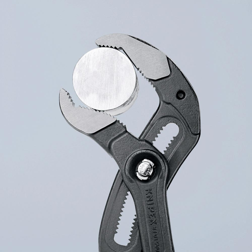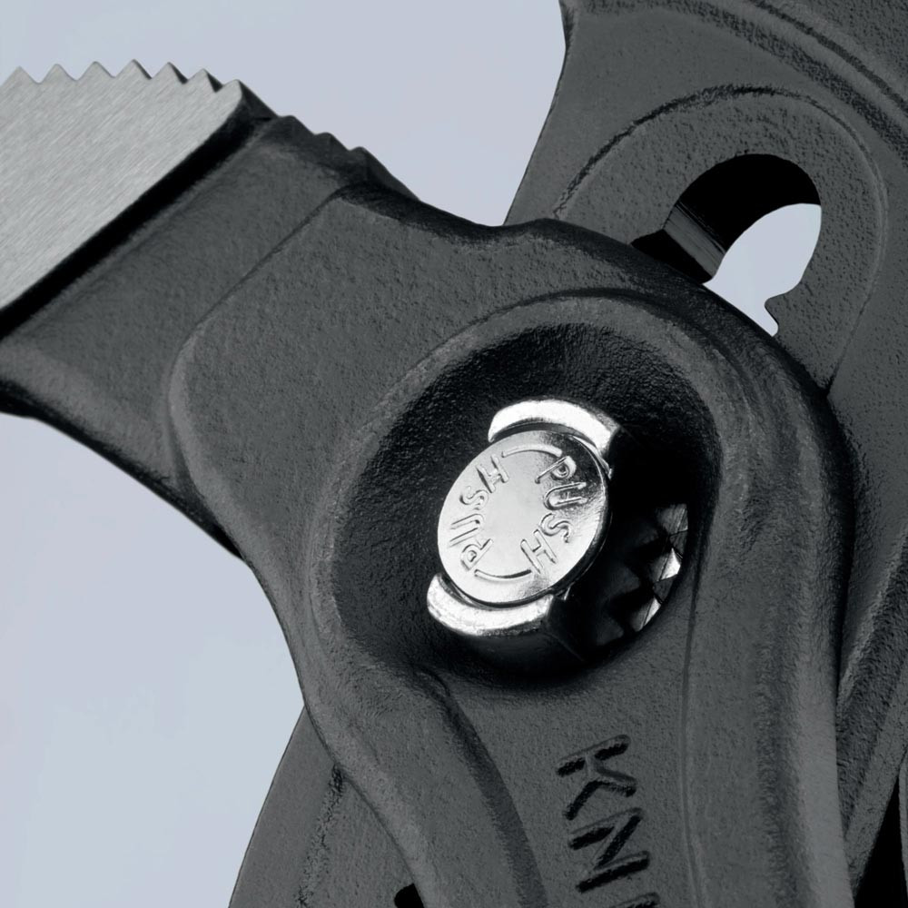 selbstklemmend an Rohren und Muttern · durchgestecktes Gelenk für hohe Stabilität durch doppelte Führung · Einstellung per Knopfdruck direkt am Werkstück · Greifflächen mit spezialgehärteten Zähnen, Härte der Zähne ca. 61 HRC · Klemmschutz · Chrom-Vanadin-Elektrostahl, geschmiedet, mehrstufig ölgehärtet