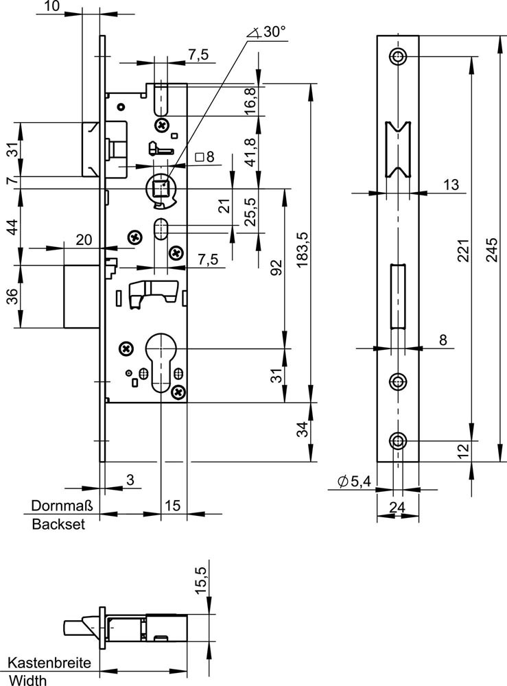 zertifiziert nach EN 12209 · U-Stulp 24 x 6 x 245 mm · Edelstahl rostfrei · vorgerichtet für Profilzylinder · Schlosskasten verzinkt und oben/unten geschlossen · Nuss 8 mm einteilig · mit Wechsel · Riegelausschluss 20 mm · 1-tourig · Falle rechts/links umlegbar
