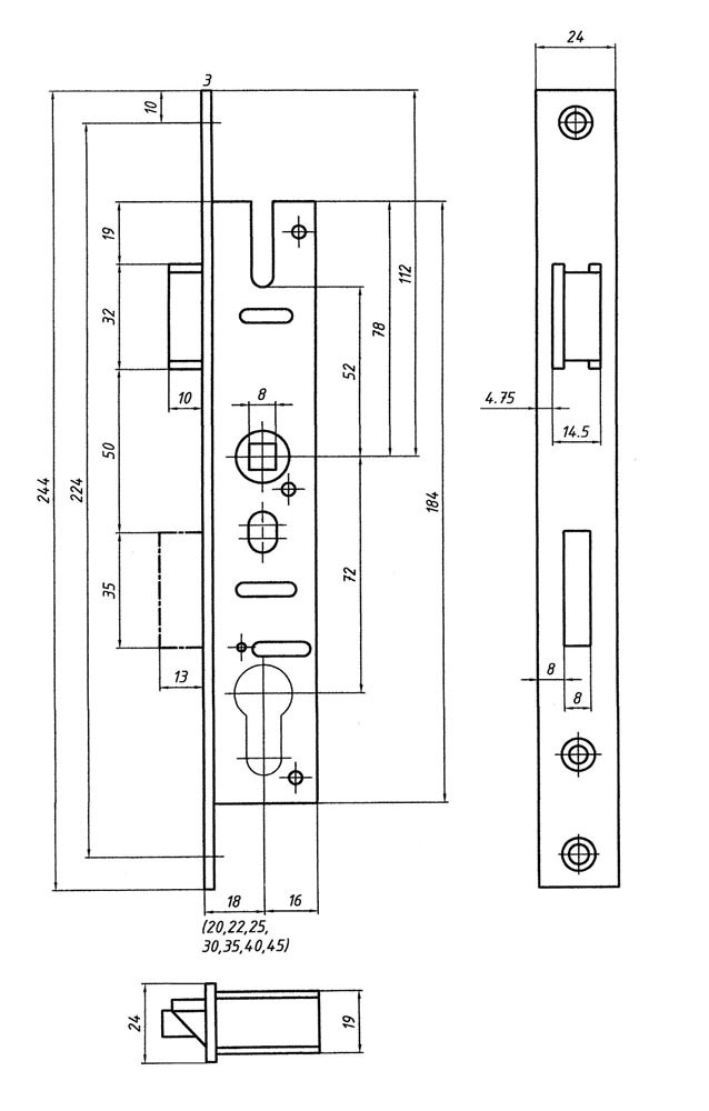 Rohrrahmen-Einsteckschloss 1004 72 PZW 24/35/72/8 mm DINlinks / rechts verzinkt Riegelausschluss 11 mm 244 mm E6432451