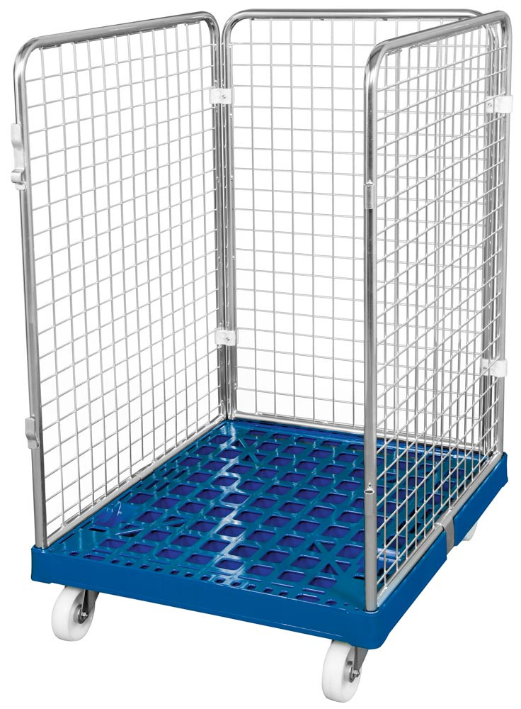 Rollbox mit Drahtgitterwänden, 3-seitig, Nutzhöhe 1020 mm, LxBxH 810x720x1200 mm, Bodenplatte aus HDPE, RAL 5010 enzianblau