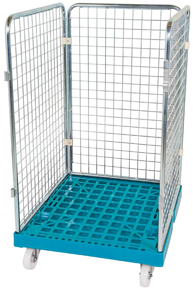Rollbox mit Drahtgitterwänden, 3-seitig, Nutzhöhe 1020 mm, LxBxH 810x720x1200 mm, Bodenplatte aus HDPE, RAL 5012 lichtblau