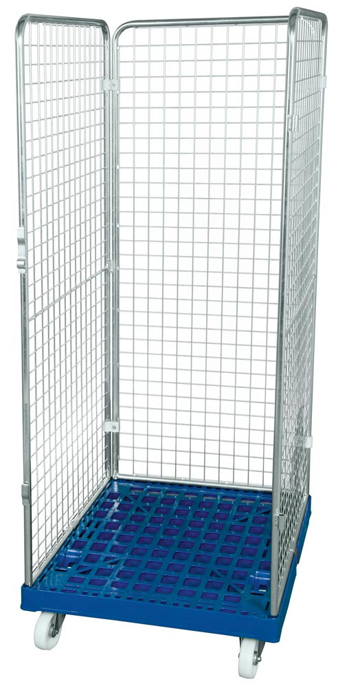 Rollbox mit Drahtgitterwänden, 3-seitig, Nutzhöhe 1585 mm, LxBxH 810x720x1800 mm, Bodenplatte aus HDPE, RAL 5010 enzianblau