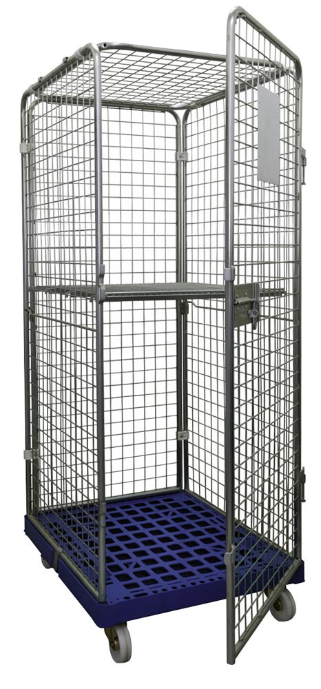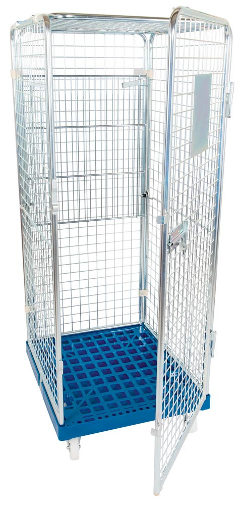 Rollbox mit Drahtgitterwänden, 5-seitig (1 Tür), 1 Boden, Nutzhöhe 1585 mm, LxBxH 810x720x1800 mm, Bodenplatte aus HDPE, RAL 5012 lichtblau E1979122