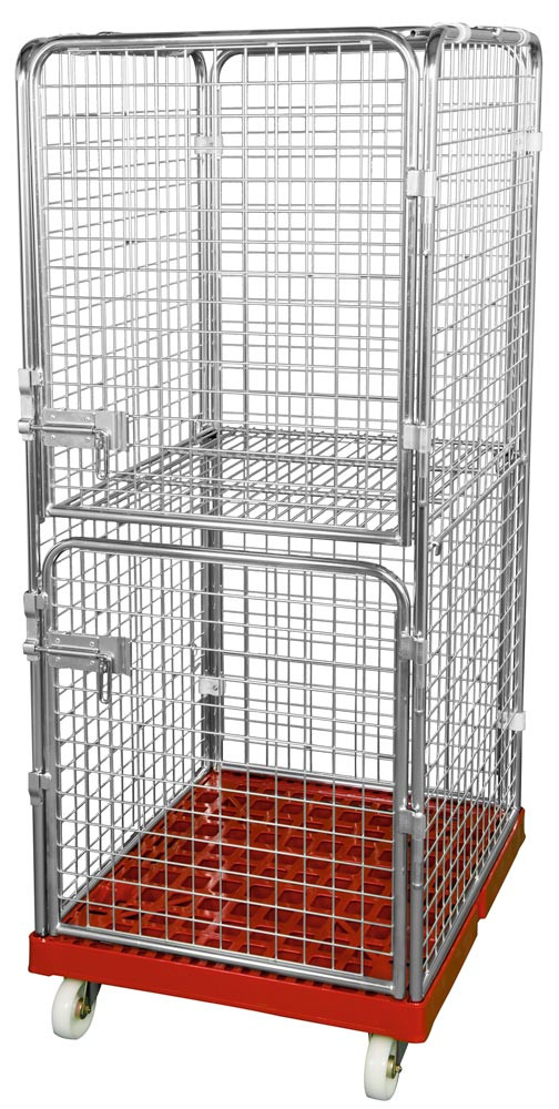 Rollbox mit Drahtgitterwänden, 5-seitig (2 Türen), 1 Boden, Nutzhöhe 1585 mm, LxBxH 810x720x1800 mm, Bodenplatte aus HDPE, RAL 3000 feuerrot E1993145
