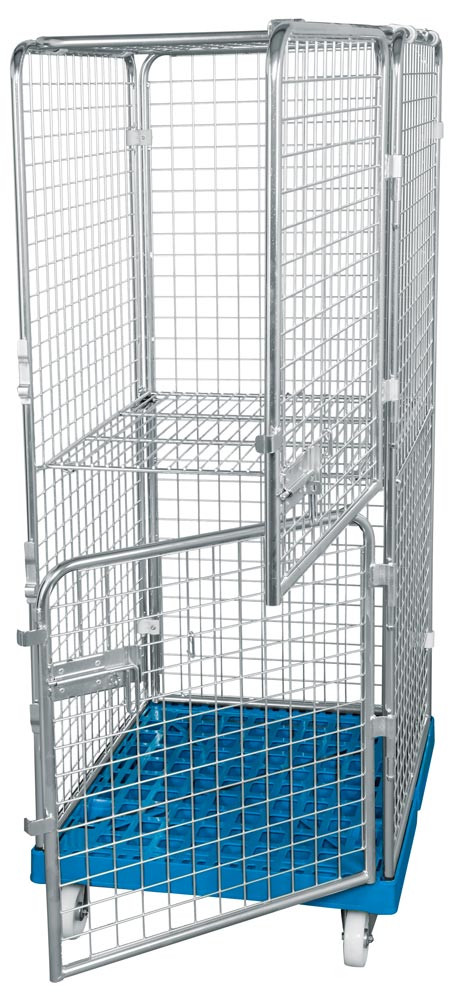 Rollbox mit Drahtgitterwänden, 5-seitig (2 Türen), 1 Boden, Nutzhöhe 1585 mm, LxBxH 810x720x1800 mm, Bodenplatte aus HDPE, RAL 5012 lichtblau E1993142