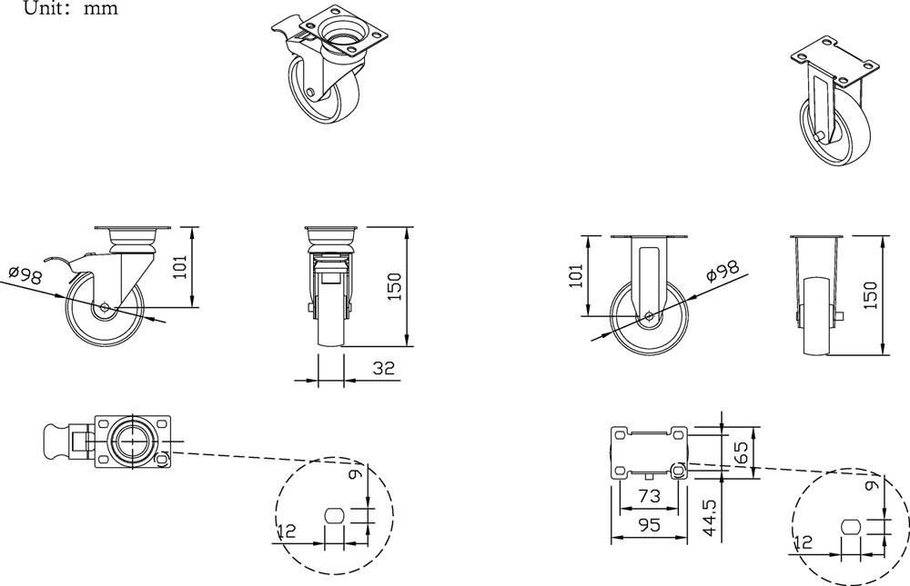 | Ausführung | 4 Rollen, 2x fix + 2x schwenkbare Rollen |