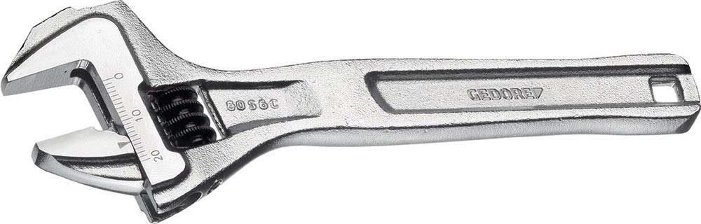 verstellbar · CV-Stahl · verchromt · Kopf geschliffen · schwedisches Modell · Rolle mit Linksgang · Maulstellung 15° · mit Einstell-/Messskala auf dem Schlüsselkopf · eine geschützte Mechanik und eine zusätzliche Schlagfläche ermöglichen leichte Schläge ohne die Funktion des Schlüssels zu beeinträchtigen