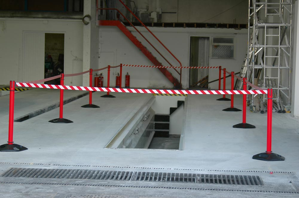 Rollgurtpfosten, für den Außenbereich, Modell Heavy Durty, Pfosten Kunststoff rot, Gurtlänge 3,65 m, Gurtfarbe rot/weiß, VE 2 Stück E845225