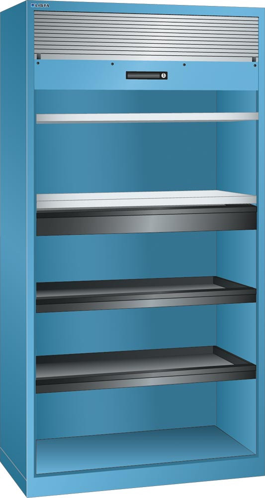 Rollladenschrank, BxTxH 1000x580x1950 mm, 2 Verstellböden, 2 Auszugböden, 1 Schublade, RAL 5012, Rolllade grau E835081