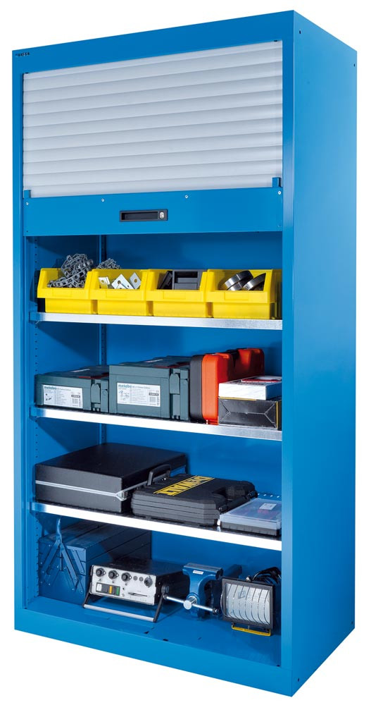 Rollladenschrank, BxTxH 1000x580x1950 mm, 4 Verstellböden, RAL 5012, Rolllade grau E835077