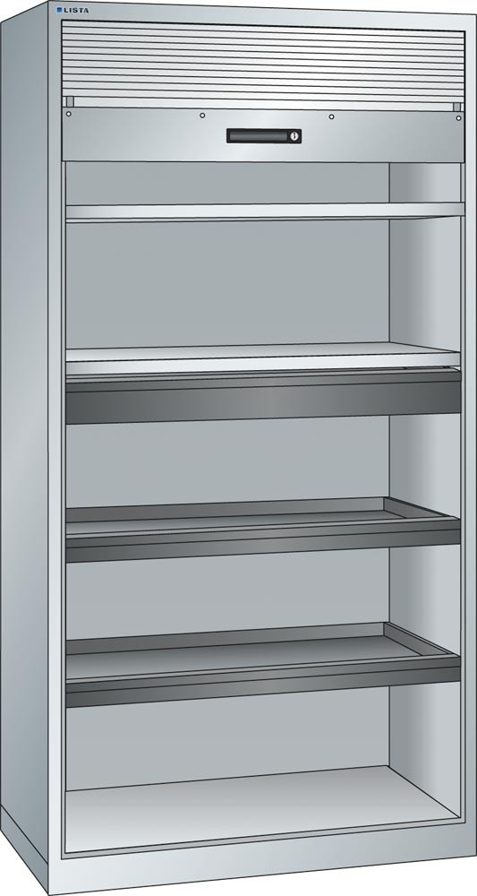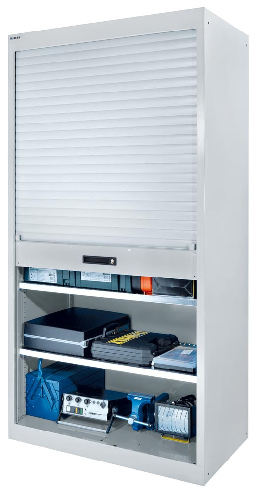 Rollladenschrank, BxTxH 1000x580x1950 mm, 2 Verstellböden, 2 Auszugböden, 1 Schublade, RAL 5012, Rolllade grau E835081