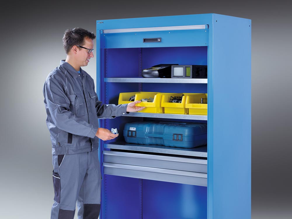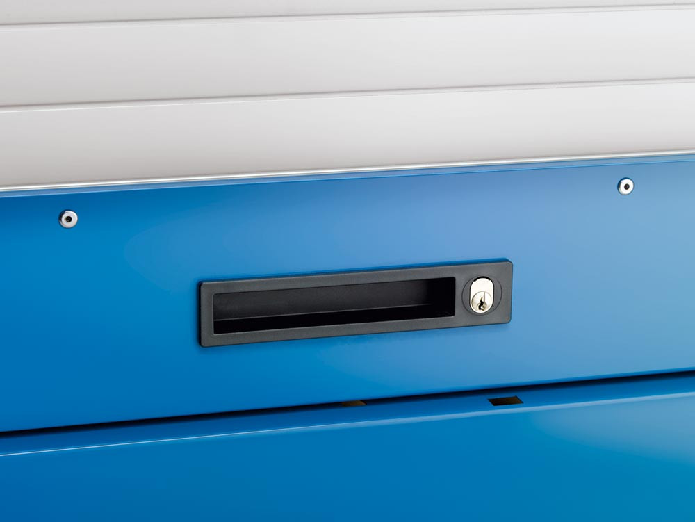 ∙ Bieten bei engen Raumverhältnissen vollen Zugriff auf das gesamte Lagergut ∙ Stabile Schließleiste aus Metall mit Klemmschutz ∙ Auswechselbarer Zylinder ∙ Inneneinrichtung im 25 mm Raster ∙ Max. Traglast: Gehäuse 500 kg ∙ Verstellböden 30 mm stark ∙ Auszugböden, Schubladen: lackiert, Farbe: RAL 7016 anthrazitgrau ∙ Rolllade: PVC, Farbe: ähnl. RAL 7035 lichtgrau ∙ Strapazierfähige Pulverlackierung