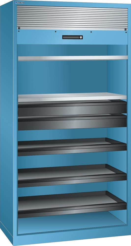 Rollladenschrank, BxTxH 1000x580x1950 mm, 2 Verstellböden, 3 Auszugböden, 2 Schubladen, RAL 5012, Rolllade grau