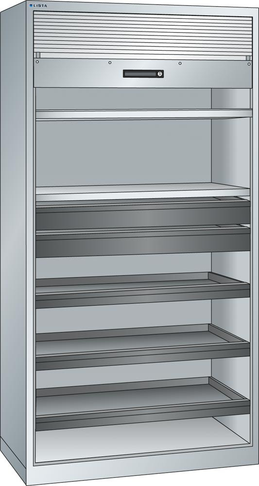 Rollladenschrank, BxTxH 1000x580x1950 mm, 2 Verstellböden, 3 Auszugböden, 2 Schubladen, RAL 7035, Rolllade grau