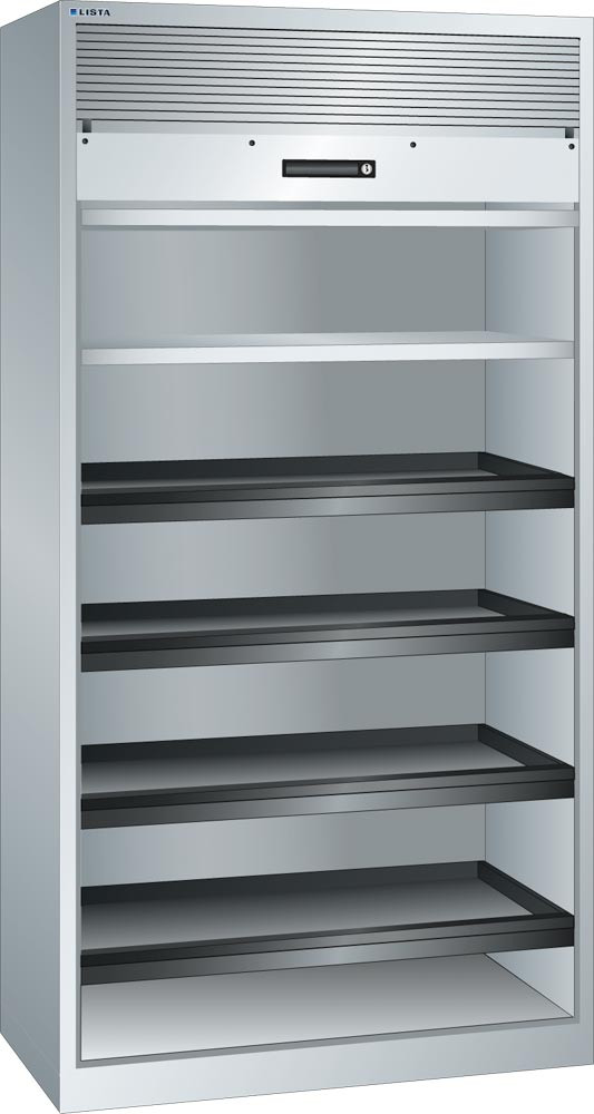 ∙ Bieten bei engen Raumverhältnissen vollen Zugriff auf das gesamte Lagergut ∙ Stabile Schließleiste aus Metall mit Klemmschutz ∙ Auswechselbarer Zylinder ∙ Inneneinrichtung im 25 mm Raster ∙ Max. Traglast: Gehäuse 500 kg ∙ Verstellböden 30 mm stark ∙ Auszugböden, Schubladen: lackiert, Farbe: RAL 7016 anthrazitgrau ∙ Rolllade: PVC, Farbe: ähnl. RAL 7035 lichtgrau ∙ Strapazierfähige Pulverlackierung