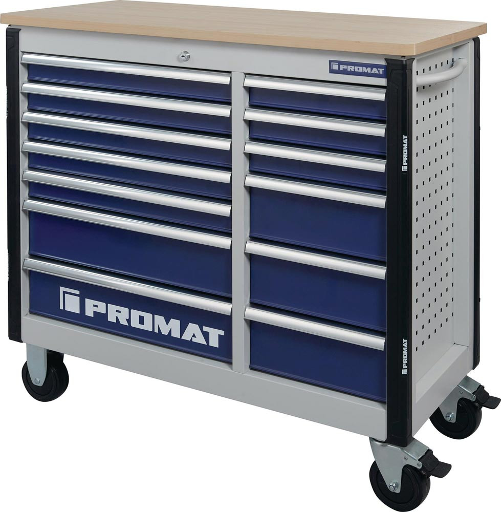 mit 13 Schubladen · Handgriff · kugelgelagerten, mit Teleskopschienen herausziehbaren Schubladen mit 100 % Auszug mit jeweils einer Antirutschmatte · automatischer Schubladeneinzug · beschriftbare Schubladen · robuste Ablagefläche bestehend aus einer 25 mm dicken MDF Platte · Einteilerset für 4 Schubladen im Lieferumfang enthalten · mit Zentralverriegelung (nur eine Schublade gleichzeitig geöffnet) · abschließbar mittels eingebauten Zylinderschloss mit 4 Schlüsseln · hochwertige PVC-Rollen Ø 127 mm - 2 starre und 2 lenkbare Rollen mit Feststellung · beidseitiges Lochwandsystem (9 x 9 mm) · für einfache Installation von Zubehörartikel · 2 Dosenhalter mit Lochung für Schraubendreher (im Lieferumfang enthalten) · durchgehender, seitlicher Kantenschutz