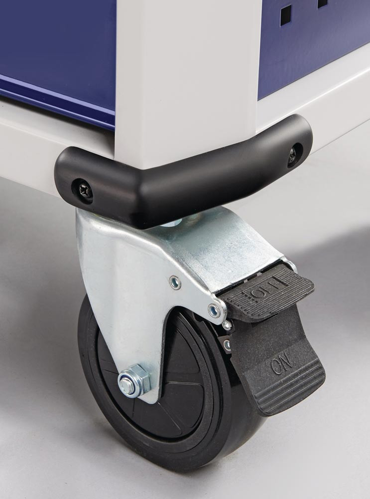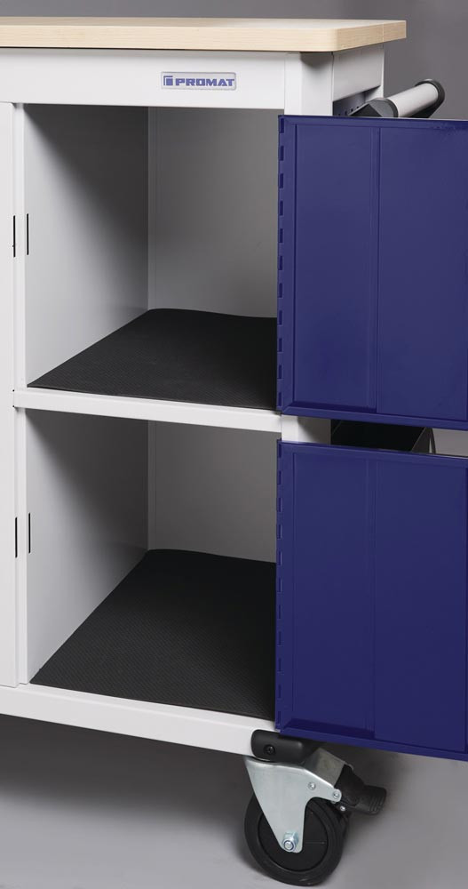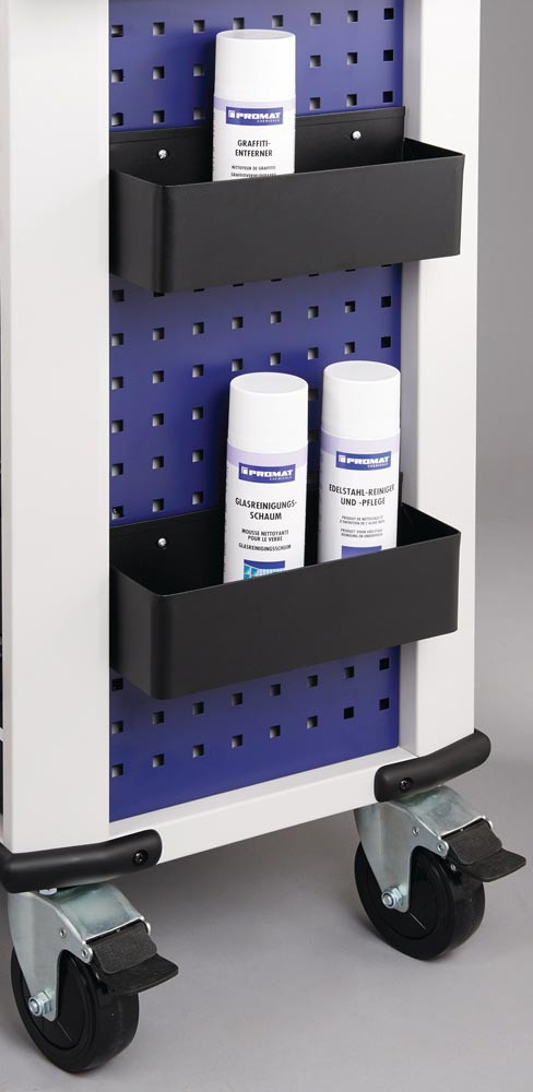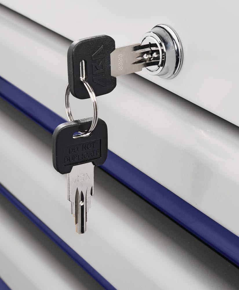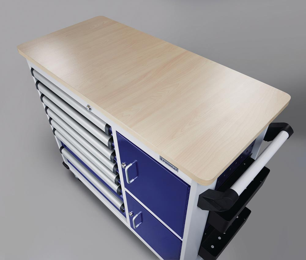 kugelgelagerte, mit Teleskopschienen herausziehbare Schubladen mit 100 % Auszug mit jeweils einer Antirutschmatte · automatischer Schubladeneinzug · robuste Ablagefläche bestehend aus einer 25 mm dicken MDF Platte · Einteilerset für 4 Schubladen im Lieferumfang enthalten · mit Zentralverriegelung (nur eine Schublade gleichzeitig geöffnet) · abschließbar mittels eingebauten Zylinderschloss mit 4 Schlüsseln · hochwertige PVC-Rollen – 2 starre und 2 lenkbare Rollen mit Feststellung · beidseitiges Lochwandsystem (9 x 9 mm) · für einfache Installation von Zubehörartikel · 2 Dosenhalter mit Lochung für Schraubendreher (im Lieferumfang enthalten) · Kantenschutz an den unteren Ecken