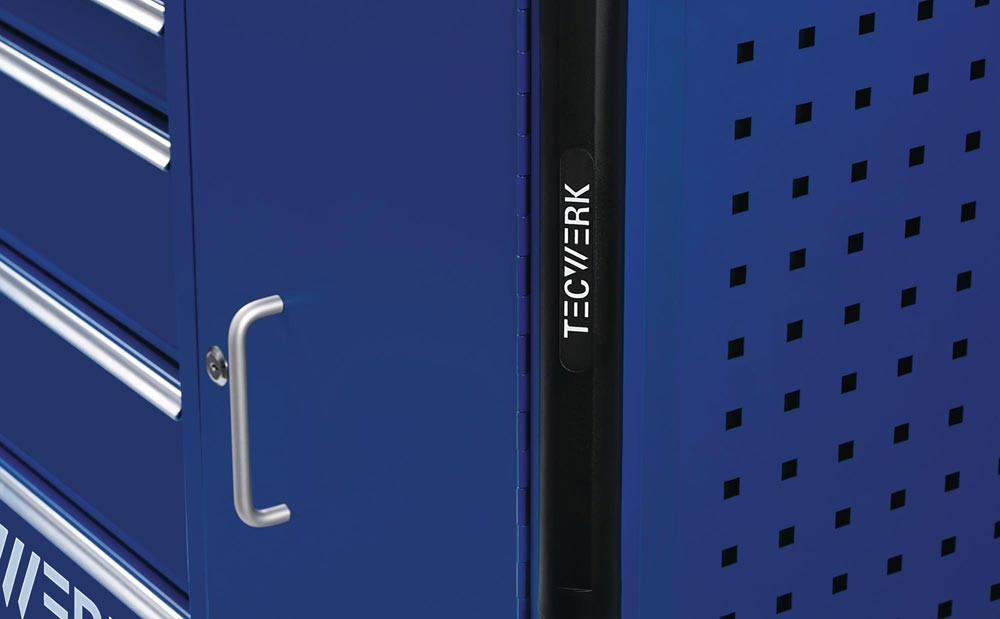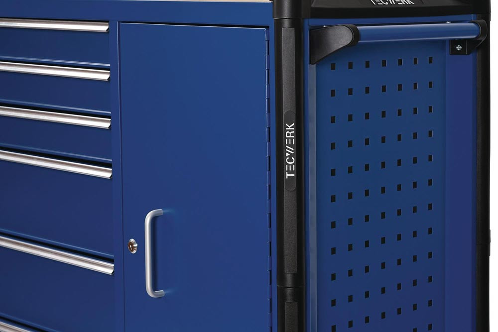mit 6 Schubladen · Handgriff · kugelgelagerte, mit Teleskopschienen herausziehbare Schubladen mit 100 % Auszug mit jeweils einer Antirutschmatte · automatischer Schubladeneinzug · Ablage aus MDF · Einteilerset für 4 Schubladen im Lieferumfang enthalten · mit Zentralverriegelung (nur eine Schublade gleichzeitig geöffnet) · abschließbar mittels eingebauten seitlichem Zylinderschloss mit 4 Schlüsseln · PP Rollen Ø 127 mm – 2 starre und 2 lenkbare Rollen mit Feststellung · beidseitiges Lochwandsystem (9 x 9 mm) für einfache Installation von Zubehörartikel · seitliches Fach mit Tür und 2 Ablageböden · abschließbar (gleichschießend zu den Schubladen) · durchgehender, seitlicher Kantenschutz