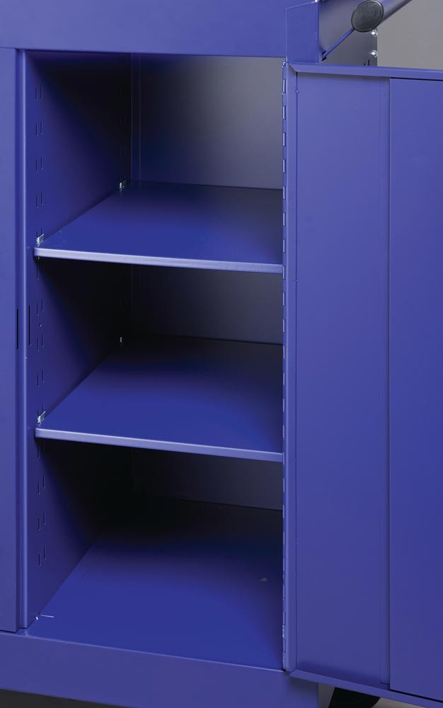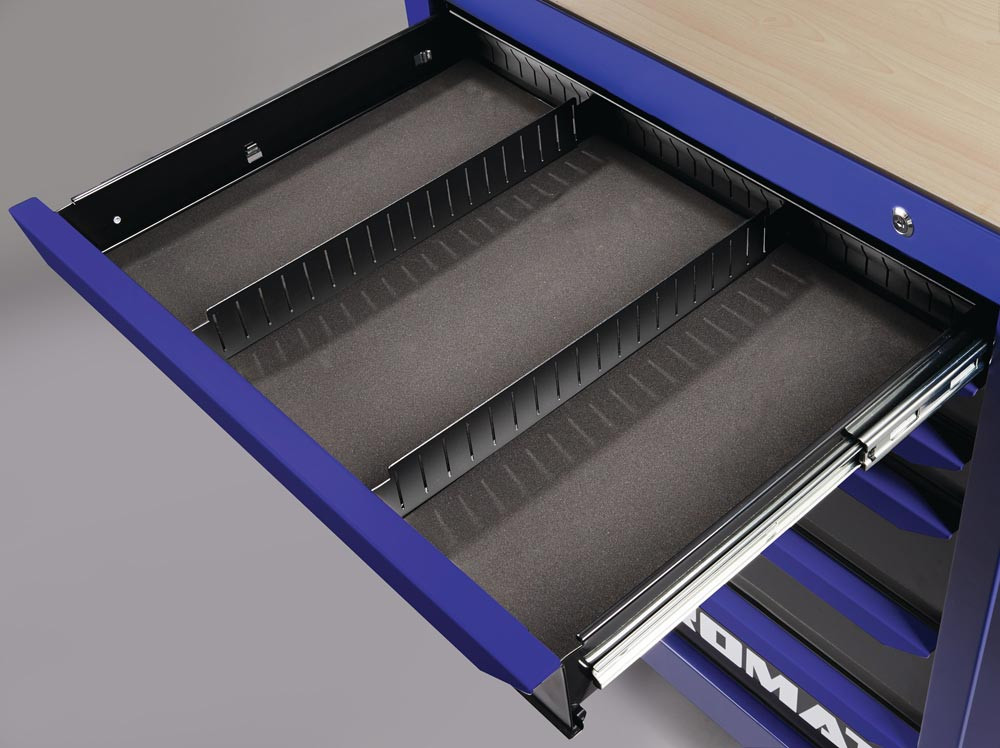mit 6 auf kugelgelagerten Teleskopschienen herausziehbaren Schubladen mit 100 % Auszug mit jeweils einer Antirutschmatte · automatischer Schubladeneinzug · robuste Ablagefläche bestehend aus einer 16 mm dicken MDF Platte · Einteilerset für 4 Schubladen im Lieferumfang enthalten · mit Zentralverriegelung (nur eine Schublade gleichzeitig geöffnet) · abschließbar mittels eingebauten Zylinderschloss mit 4 Schlüsseln · PP Rollen – 2 starre und 2 lenkbare Rollen mit Feststellung · beidseitiges Lochwandsystem (9 x 9 mm) für einfache Installation von Zubehörartikel · seitliches Fach mit Tür und 2 Ablageböden verschließbar