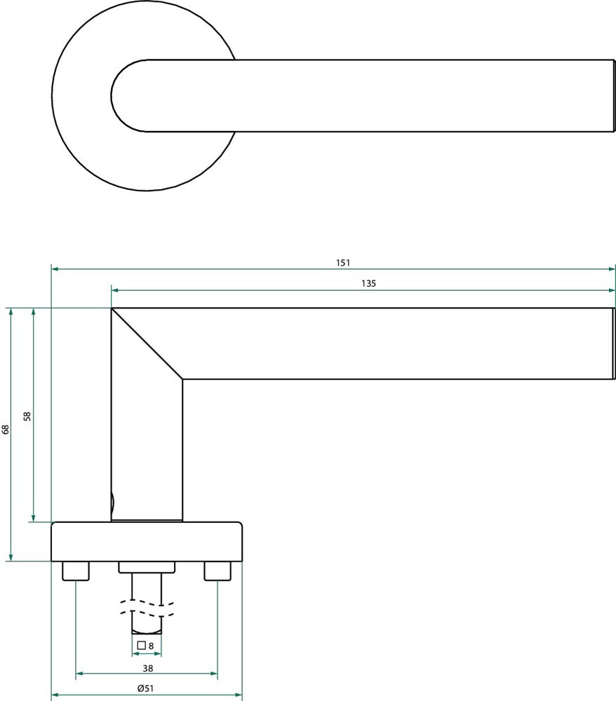 für Zimmertüren · Gehrungsdrücker L-Form · Drücker-Ø 19 mm · Drückerrosette mit Hochhaltefeder · Rosetten-Ø 51 mm, mit Nocken · Rosetten-Stärke 10 mm · mit 8 mm Vierkantstift und Befestigungsschrauben für Türstärken bis 42 mm · Drückerlänge 135 mm · Drückergarnitur · DIN links / rechts