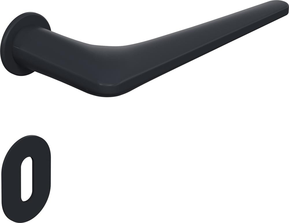 Zimmergarnitur mit Schlüsselrosetten · mit flacher Drückerrosette, Abdeck-Kappe aus mattem Polyamid, Türdrücker Modell 251.21PBM in Gehrungsform aus mattem Polyamid mit durchgehendem Stahlkern, Vierkantstift 8 mm, für Österreich 8,5 mm, mit Trapezgewinde · Fixierung der Drücker in einem Einpresslager und einer Polyamid-Gleitlagerbuchse · mit Schlüsselrosette 306PBM, 32 x 47 mm · Montage der Einpressbuchsen mittels Montagemutter mit Trapezgewinde, SW 19, mit einem Ringschlüssel SW 19 · die Montage wird empfohlen an stumpfen wie auch gefälzten Wohnraum- und Innentüren mit HDF-Deckplatte und Mittellagen aus Röhrenspan- bzw. Vollspaneinlage oder hochwertiger