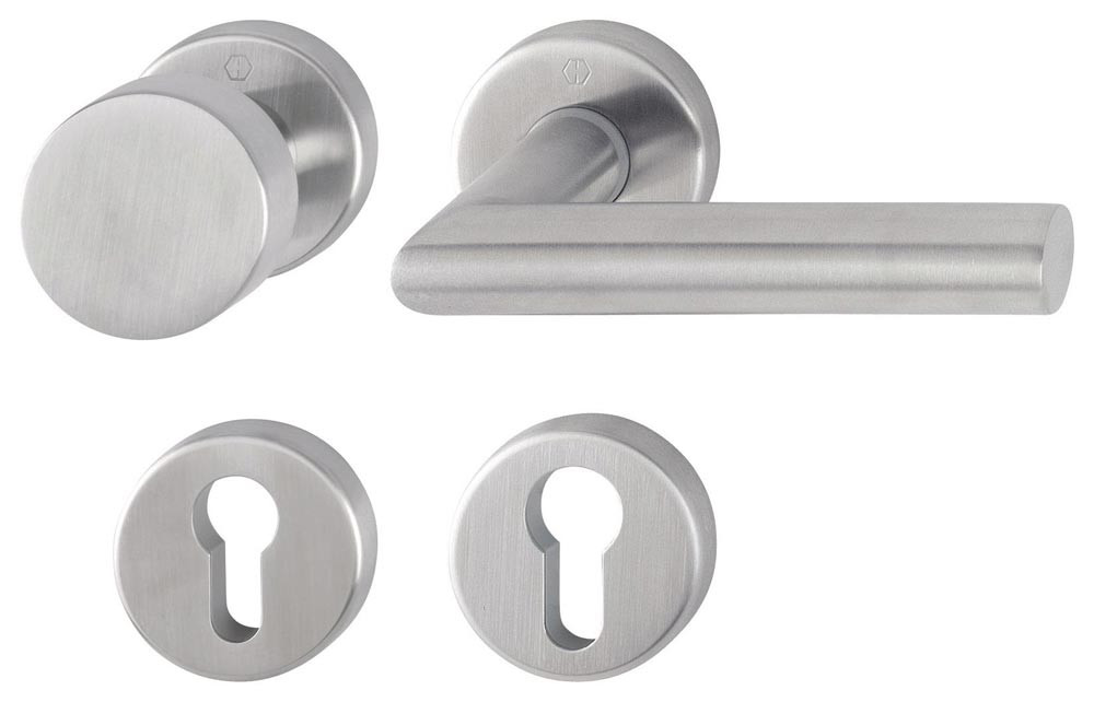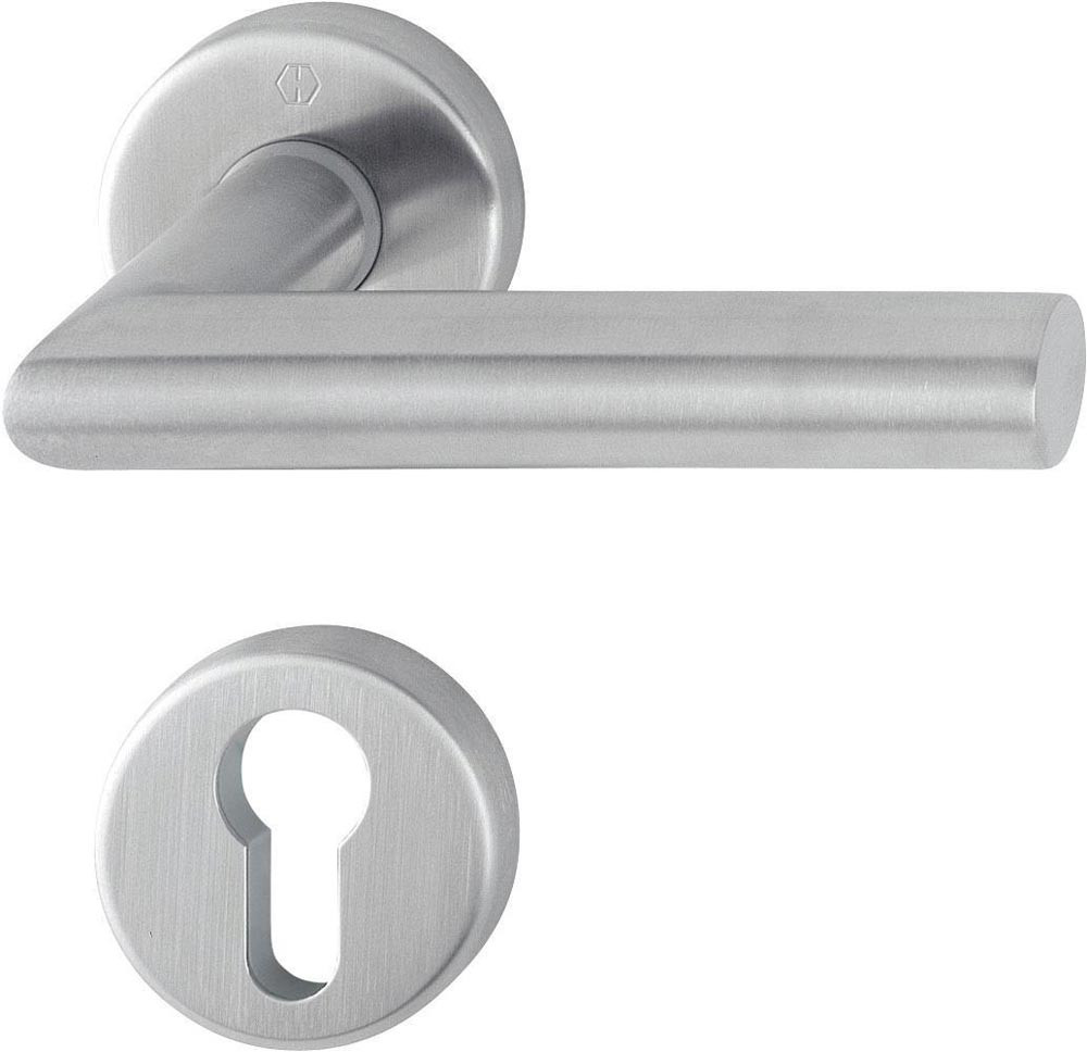 HOPPE-Edelstahl-Rosetten-Türgriff-Garnitur mit Schlüsselrosetten für Innentüren, geprüft nach DIN EN 1906: 37-0140A, Objekt-Garnitur Lagerung: Türgriffe lose, Rückholfedern rechts/links verwendbar, wartungsfreie Gleitlager Verbindung: HOPPE-Schnellstift mit HOPPE-Vollstift (Stift-/Lochteil) Unterkonstruktion: Kunststoff, Stütznocken Befestigung: verdeckt, durchgehend, wechselseitig, Mehrzweckschrauben