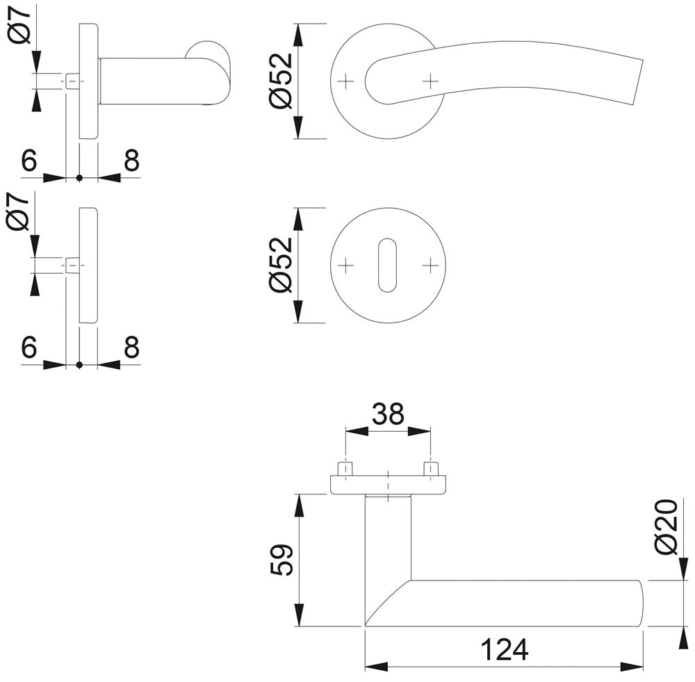Rosetten-Garnitur mit Schlüsselrosetten · geprüft nach DIN EN 1906: 37-0140A (Gebrauchs-Kategorie Klasse 3), Objekt-Garnitur · Lagerung: Türgriffe lose, Rückholfedern rechts/links verwendbar , wartungsfreie Gleitlager · mit Schnellstift-Verbindung bei D/D mit HOPPE-Vollstift (Loch-/Lochteil), bei K/D mit HOPPE-FDW-Vollstift (Lochteil)· Unterkonstruktion: Kunststoff, Stütznocken · Befestigung: verdeckt, durchgehend, wechselseitig, Mehrzweckschrauben