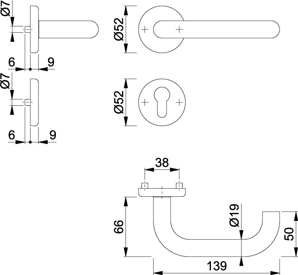 Innentür-Rosetten-Garnitur · Türgriffe mit Profilstift-Verbindung (8 mm Vierkant) für Türstärke 38-42 mm und Rückholfeder · Rosetten mit Stütznocken unsichtbar verschraubt · Anschlagrichtung DIN links / rechts