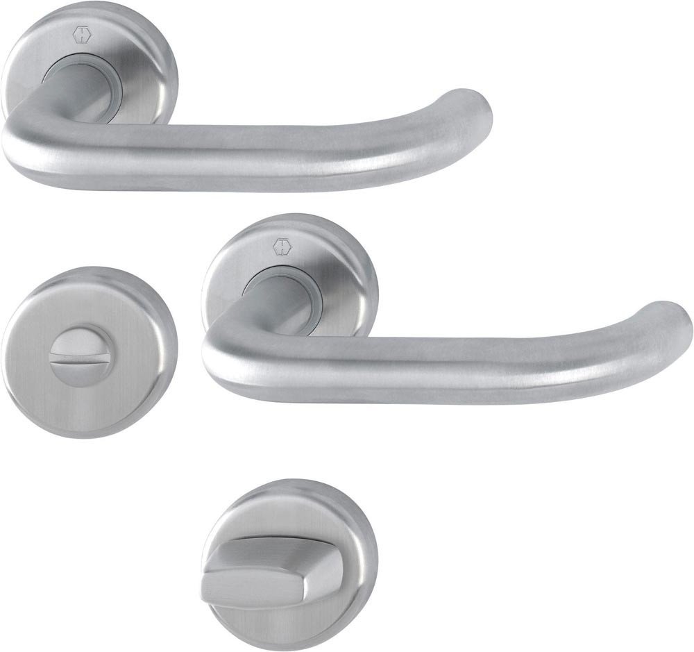 HOPPE-Edelstahl-Rosetten-Türgriff-Garnitur mit Schlitzkopf/Olive für Bad/WC-Türen, Lagerung: Türgriffe lose, Rückholfedern rechts/links verwendbar, wartungsfreie Gleitlager Verbindung: HOPPE-Profilvollstift (Stift-/Lochteil) Unterkonstruktion: Kunststoff, Stütznocken Befestigung: verdeckt, durchgehend, wechselseitig, Mehrzweckschrauben
