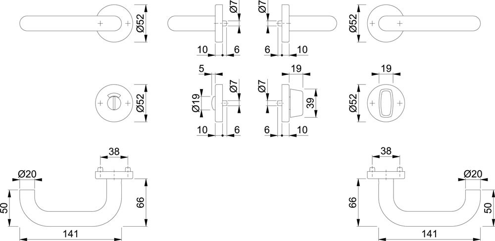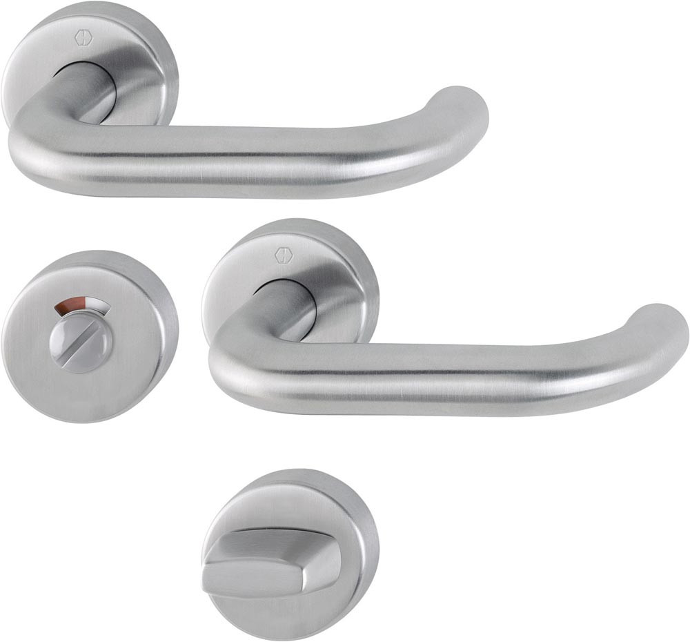 Rosetten-Türgriff-Garnitur mit Schlüsselrosetten für Innentüren · geprüft nach DIN EN 1906: 47-0150A und PIVCERTPlus (1.000.000 Prüfzyklen), Objekt-Garnitur (Gebrauchs-Kategorie Klasse 4) · Lagerung: Türgriffe fest/drehbar (Wechselgarnitur: außen Knopf fest), Rückholfedern, HOPPE-Steckgriff-Verbindung mit Kugel-Arretierung Sertos®, wartungsfreie Gleitlager · Verbindung: HOPPE-Profilvollstift (Drückergrt.) / HOPPE-FDW-Profilvollstift (Wechselgrt.), gehärtet · Unterkonstruktion: Griffrosetten Stahl, Schlüsselrosetten Kunststoff, Stütznocken · Befestigung: verdeckt, durchgehend · Griffrosetten-Gewindeschrauben M5 · Schlüsselrosetten Mehrzweckschrauben, wechselseitig · TS 40 - 45 mm