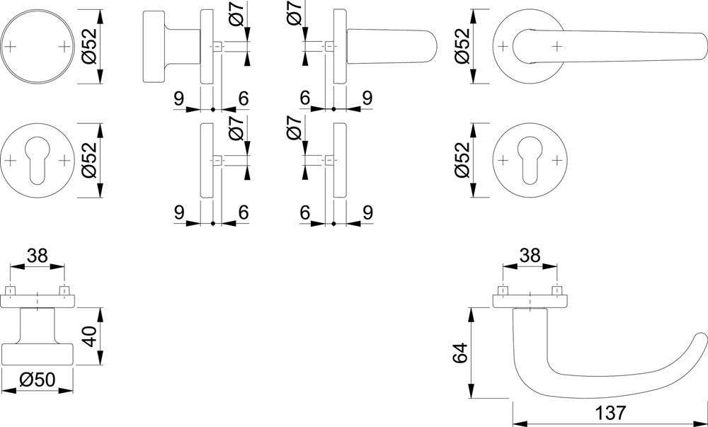 Innentür-Rosetten-Garnitur nach DIN EN 1906 (Gebrauchs-Kategorie Klasse 3) · Türgriffe mit Schnellstift-Verbindung (mit 8 mm Vollstift) für Türstärke 37 - 42 mm · Rosette mit Kunststoff-Unterkonstruktion, Rückholfeder und Stütznocken · Befestigung verdeckt, durchgehend · wechselseitig inkl. Mehrzweckschrauben · Anschlagrichtung DIN links / rechts