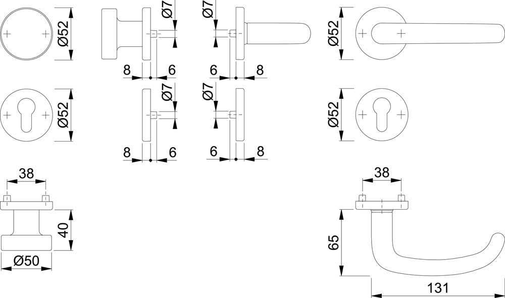 Innentür-Rosetten-Garnitur nach DIN EN 1906 (Gebrauchs-Kategorie Klasse 3) · Türgriffe mit Schnellstift-Verbindung (mit 8 mm Vollstift) für Türstärke 37 - 42 mm · Rosette mit Kunststoff-Unterkonstruktion, Rückholfeder und Stütznocken · Befestigung verdeckt, durchgehend · wechselseitig inkl. Mehrzweckschrauben · Anschlagrichtung DIN links / rechts