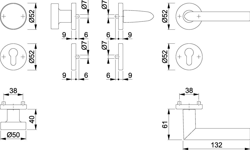 Innentür-Rosetten-Garnitur geprüft nach DIN EN 1906 (Gebrauchs-Kategorie Klasse 3) · Türgriffe mit Schnellstift-Verbindung (mit 8 mm Vollstift) für Türstärke 37-42 mm und Rückholfeder · Rosetten mit Stütznocken unsichtbar verschraubt · Drückerlänge bei Aluminium 132 mm, bei Edelstahl 131 mm · Anschlagrichtung DIN links / rechts