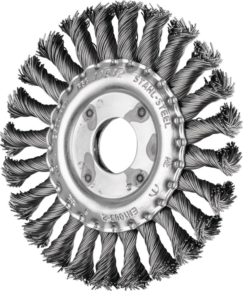 gezopfter Draht · aggressiv arbeitende Bürste · für schwere Bürstarbeiten im Metallbau wie Entzundern, Entrosten, Entgraten, Putzen von Schweißnähten und Entfernen von Kleberresten geeignet · Bohrung 22,2 mm Ø