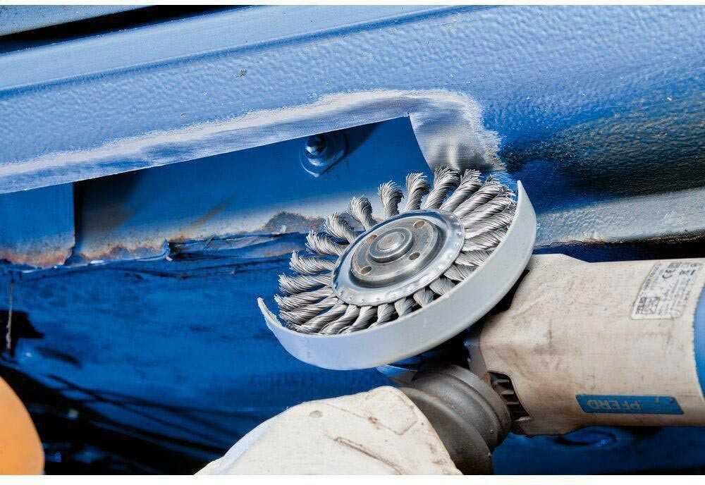 gezopfter Draht · aggressiv arbeitende Bürste · für schwere Bürstarbeiten im Metallbau wie Entzundern, Entrosten, Entgraten, Putzen von Schweißnähten und Entfernen von Kleberresten geeignet · Bohrung 22,2 mm Ø
