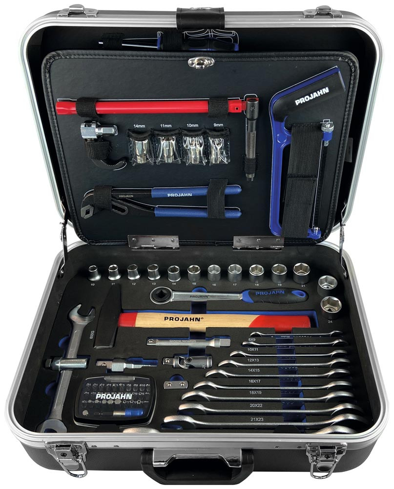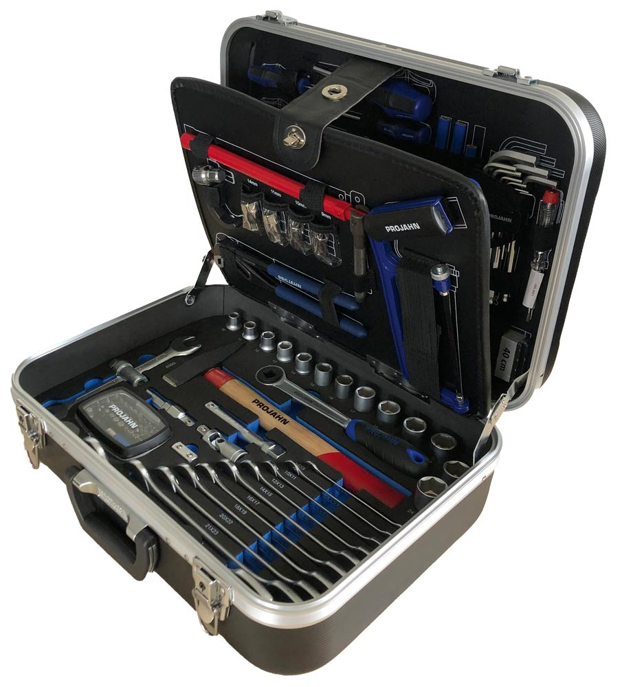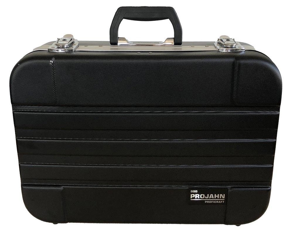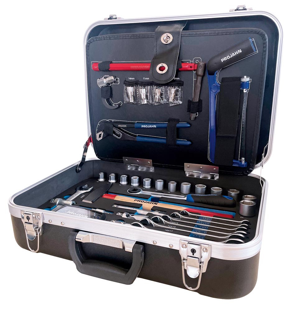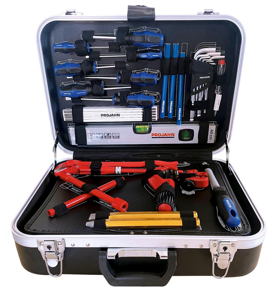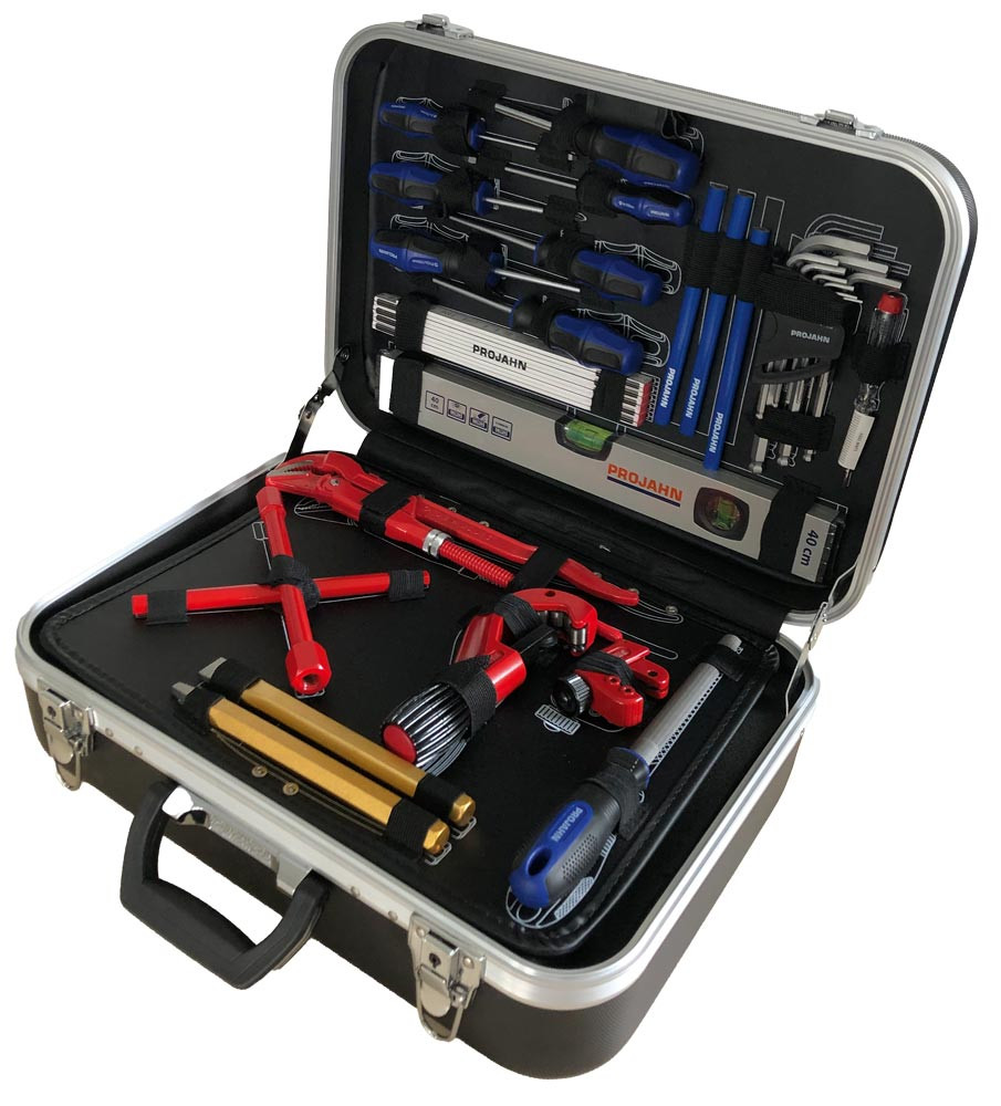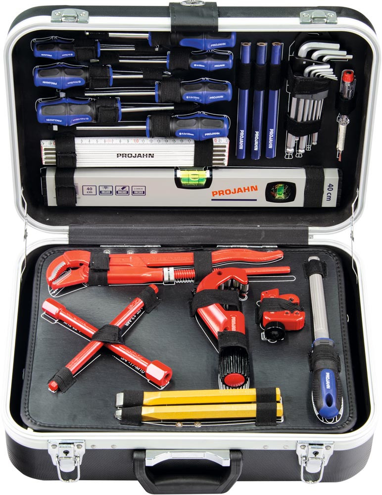 Ausführung: Umfangreiches "Profi-Werkzeug"-Sortiment für das Sanitär-Handwerk in praxisgerechter Zusammenstellung ∙ Schalenkoffer aus schlagfestem ABS-Kunststoff ∙ Mit 2 doppelseiteigen Werkzeugtafeln mit Einstecktaschen ∙ Zwei abschließbare Schlösser einschl. Schlüssel