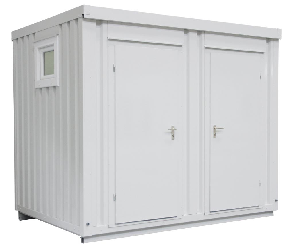 Material: Wände und Dach außen, Trapezblech verzinkt ∙ Wände und Dach innen, liniertes verzinktes Blech ∙ Beschichtung innen und außen in RAL 9002 grauweiß · Seitenwände und Dach bestehend aus PIR Hochleistungsdämmpaneelen