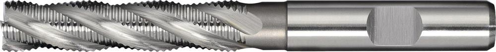 HSS-Co5 · TiCN-beschichtet · DIN 844 · Typ HR · Vierschneider · lang · 45° Schutzfase · Zentrumschnitt · hinterschliffenes feines Kordelprofil · Zylinderschaft mit Mitnahmefläche · rechtsschneidend · zum Fräsen von Werkstoffen mit Festigkeit bis ca. 1200 N/mm²