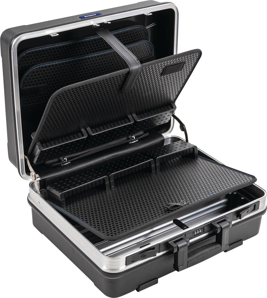 Schalen aus hochschlagzähem ABS-Material · robuster Aluminiumrahmen mit Stoßkantenschutz schützt das Werkzeug und den Koffer · schwarz · 2 abschließbare Kippschlösser sowie ein Zahlenschloss sorgen für höchste Sicherheit · 4 zusätzliche Bodenfüße sorgen für besondere Stabilität · Bodenschale durch Aluminium-Trennstege variabel unterteilbar · zusätzliches Dokumentenfach im A4 Format · mit Scharnierabdeckung und Sicherheitsdeckelhalter