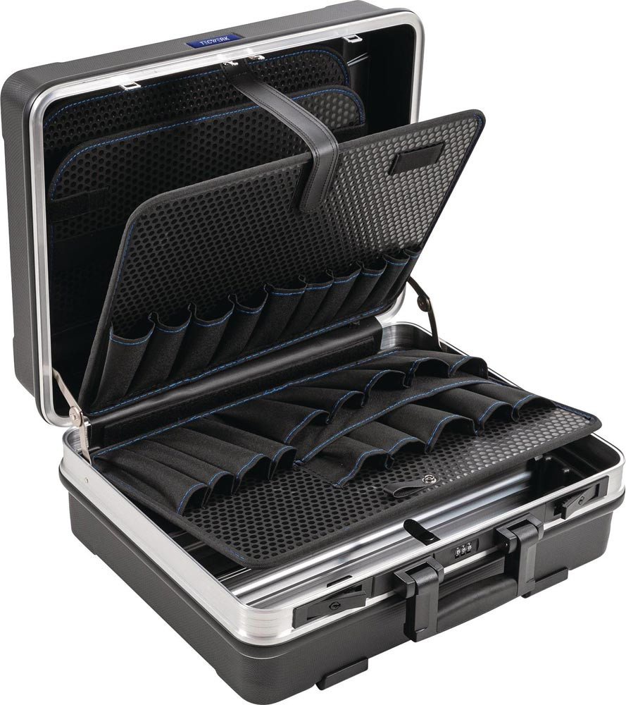 Schalen aus hochschlagzähem ABS-Material · robuster Aluminiumrahmen mit Stoßkantenschutz schützt das Werkzeug und den Koffer · schwarz · 2 abschließbare Kippschlösser sowie ein Zahlenschloss sorgen für höchste Sicherheit · 4 zusätzliche Bodenfüße sorgen für besondere Stabilität · Bodenschale durch Aluminium-Trennstege variabel unterteilbar · zusätzliches Dokumentenfach im A4 Format · mit Scharnierabdeckung und Sicherheitsdeckelhalter