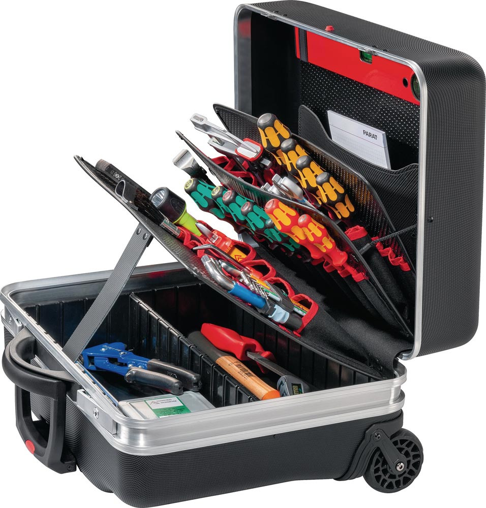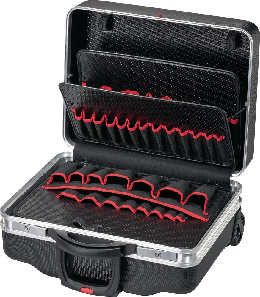 Doppel-Aluminiumrahmen · robuste, rutschfeste X-ABS Außenschale · bis zu 50 Werkzeuge lassen sich in zwei Werkzeugtafeln sicher verstauen · frei unterteilbare, mit 88 mm extratiefe Bodenschale · mit Wasserwaagen-Halterung sowie Visitenkartenfächer, Stiftschlaufen und Dokumentenfach im Kofferdeckel · bis zu 30 kg belastbar · 4-fach-Teleskopauszug · große Leichtlaufrollen · Rasterscharniere mit praktischer Kofferdeckelarretierung