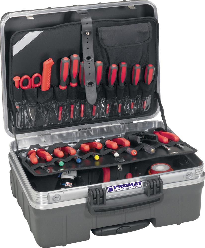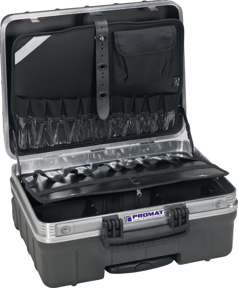 rollbar mit hoher Bodenschale · aus Polypropylen · 3-fach Teleskopauszug, 665 mm lang · gummierte, gelagerte, große Laufrollen · breiter Radstand · extrem schlagfest · robuste, feuchtigkeitsbeständige, herausnehmbare Werkzeugtafeln · eine Werkzeugtafel doppelt bestückbar · umlaufender Aluminiumrahmen · Kippzylinderschlösser · Rasterscharniere · Bodengleiter · abschließbar · Tragfähigkeit 25 kg · Ausstattung: