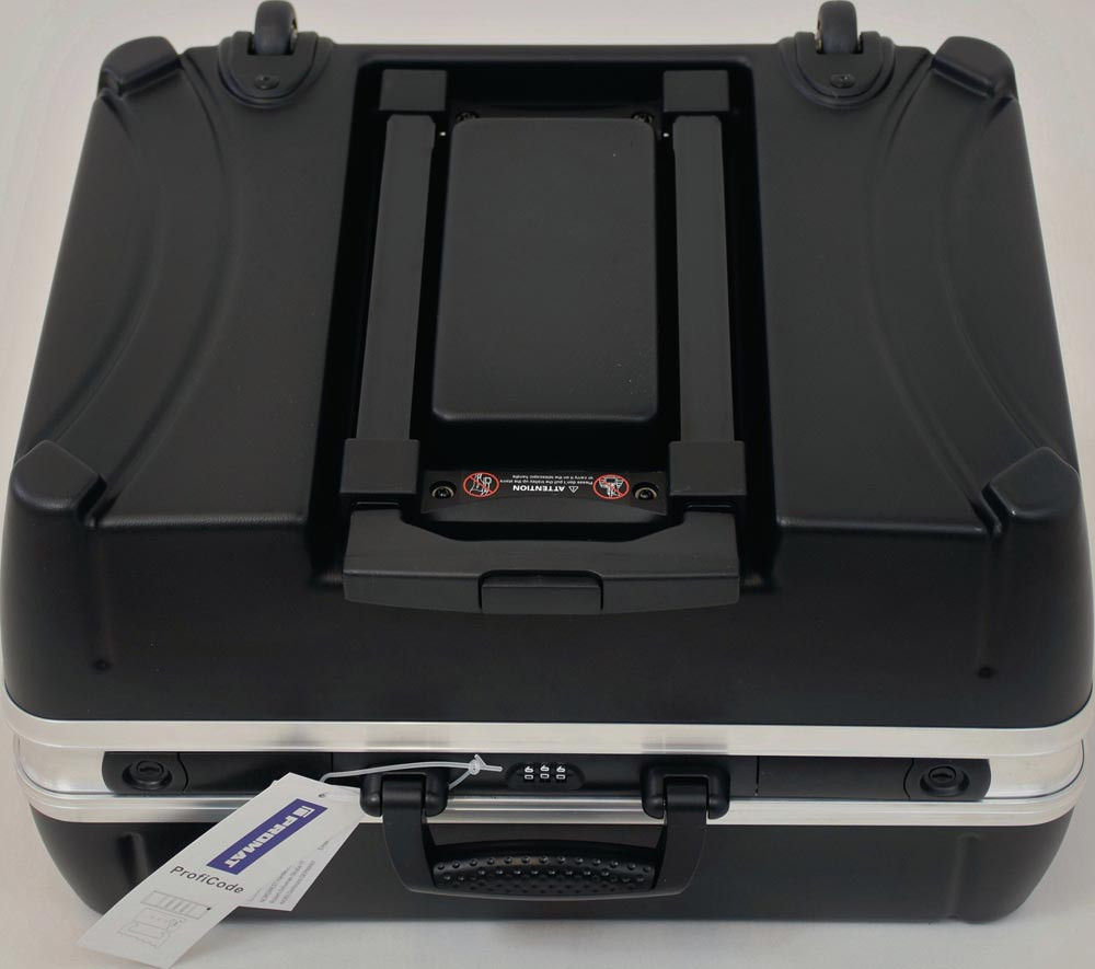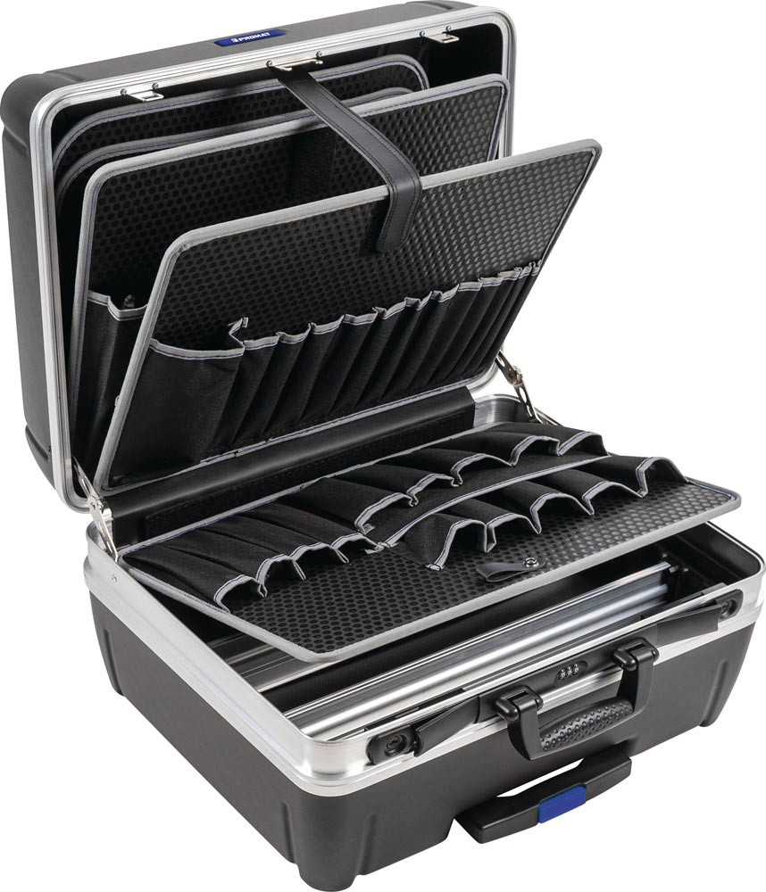 rollbar · mobiler flugtauglicher Werkzeugkoffer · Schalen aus robustem HDPE-Material · robuster Aluminiumrahmen mit Stoßkantenschutz schützt das Werkzeug und den Koffer · schwarz · 2 abschließbare Kippschlösser sowie ein Zahlenschloss sorgen für höchste Sicherheit · Bodenschale durch Aluminium-Trennstege variabel unterteilbar · zusätzliches Dokumentenfach im A4 Format · mit Scharnierabdeckung und Sicherheitsdeckelhalter