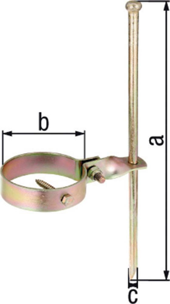SB-verpackt · ein Set bestehend aus einer Schelle, einem Erdnagel und einer Schlüsselschraube · Material: Stahl roh · Oberfläche: galvanisch gelb verzinkt ·Einzelteile durch Kabelbinder verbunden · Maß a: 400mm · Maß b: 100mm · Maß c: 12mm · Aufgrund von Umstellungen der Oberfläche kann dieser Artikel in unterschiedlichen Ausführungen (gelb-verzinkt, sendzimirverzinkt oder verzinkt-dickschicktpassiviert) geliefert werden.